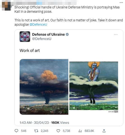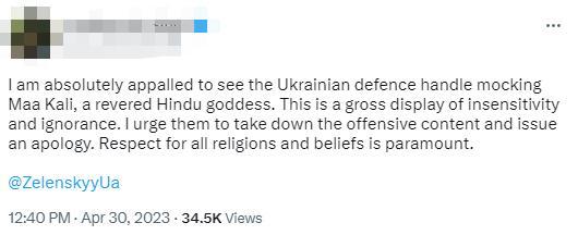《印度斯坦時(shí)報(bào)》稱,這張圖被認(rèn)為丑化了印度教女神,是“對(duì)印度教的不尊重”,推文“遭到強(qiáng)烈反對(duì)”“傷害了印度人的感情”。甚至有印度網(wǎng)友呼吁印度官方干預(yù)此事。目前,烏克蘭國(guó)防部已經(jīng)刪除該推文。