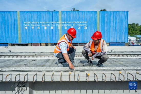 4月26日,在馬來西亞吉蘭丹州的馬東鐵項(xiàng)目一分部制梁場(chǎng),技術(shù)主管鄧友志(右)和馬來西亞本地青年員工鄧德緯討論生產(chǎn)情況。五月初的馬來西亞烈日炎炎,中馬共建“一帶一路”的標(biāo)志性項(xiàng)目——馬來西亞東海岸鐵路(馬東鐵)建設(shè)如火如荼。十支由中馬兩國(guó)員工組成的青年突擊隊(duì)活躍在全長(zhǎng)600多公里的馬東鐵沿線建設(shè)現(xiàn)場(chǎng),用汗水和擔(dān)當(dāng)抒寫屬于這個(gè)時(shí)代的青春篇章。新華社記者 朱煒 攝