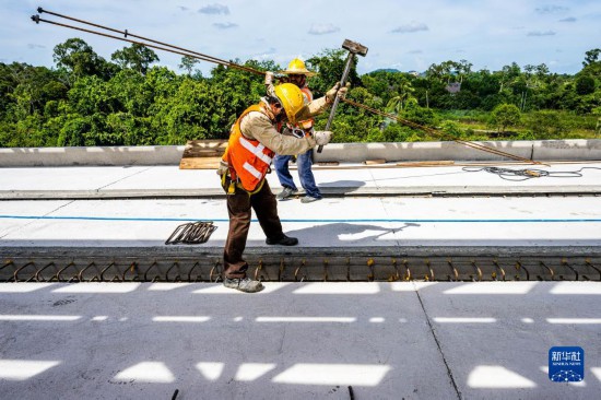 4月26日,工人在馬來西亞吉蘭丹州的馬東鐵項(xiàng)目一分部5號(hào)橋建設(shè)現(xiàn)場(chǎng)工作。新華社記者 朱煒 攝