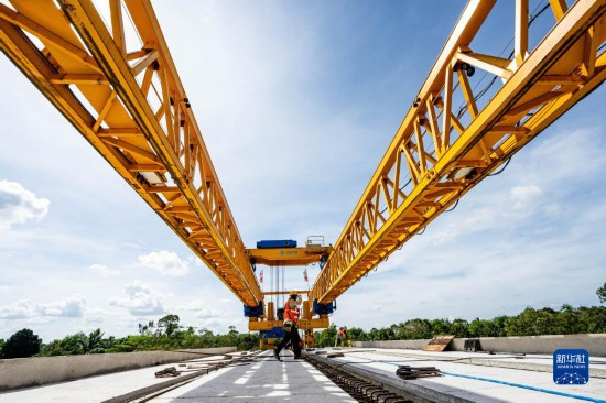 4月26日,工人在馬來西亞吉蘭丹州的馬東鐵項(xiàng)目一分部制梁場(chǎng)工作。新華社記者 朱煒 攝