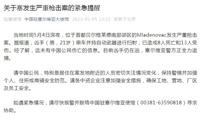 中新網(wǎng)5月5日電 據(jù)中國駐塞爾維亞大使館微信公眾號消息,當(dāng)?shù)貢r間5月4日深夜,位于首都貝爾格萊德南部郊區(qū)的Mladenovac發(fā)生嚴(yán)重槍擊案。據(jù)報道,兇手(男,21歲)乘車并持自動武器進(jìn)行掃射,已造成8人死亡和13人受傷。經(jīng)了解,迄未有中國公民傷亡的信息。目前兇手仍在逃,塞爾維亞警方正全力追捕。