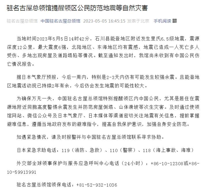 為確保萬無一失,中國駐名古屋總領(lǐng)館特別提醒領(lǐng)區(qū)內(nèi)中國公民,尤其是居住在震源地附近同胞高度警惕余震發(fā)生并防范房屋倒塌、山體滑坡等次生災(zāi)害。及時通過使領(lǐng)館網(wǎng)站、微信公眾號及日本氣象廳、日本媒體等渠道密切關(guān)注地震有關(guān)信息,提前掌握避難信息,遵循當(dāng)?shù)卣l(fā)布的避難指令,提高自我保護(hù)意識,加強(qiáng)自身安全防范。