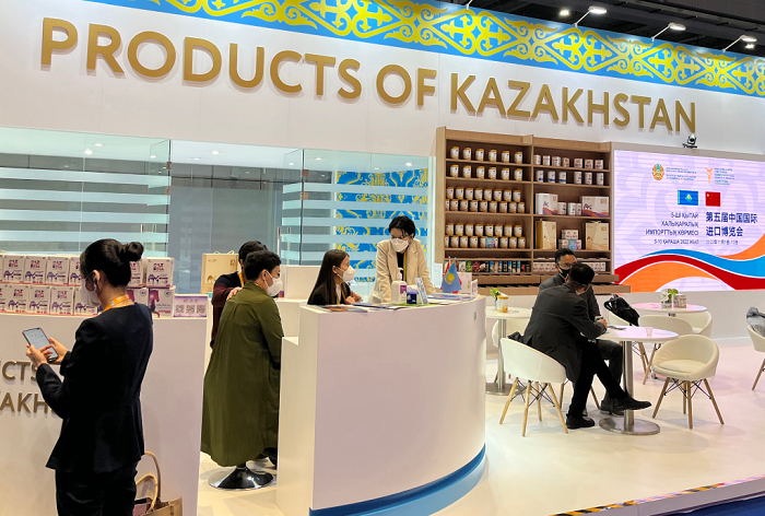 這是2022年11月6日在第五屆進(jìn)博會(huì)上拍攝的哈薩克斯坦產(chǎn)品展區(qū)。 新華社記者 鄭冬睿 攝
