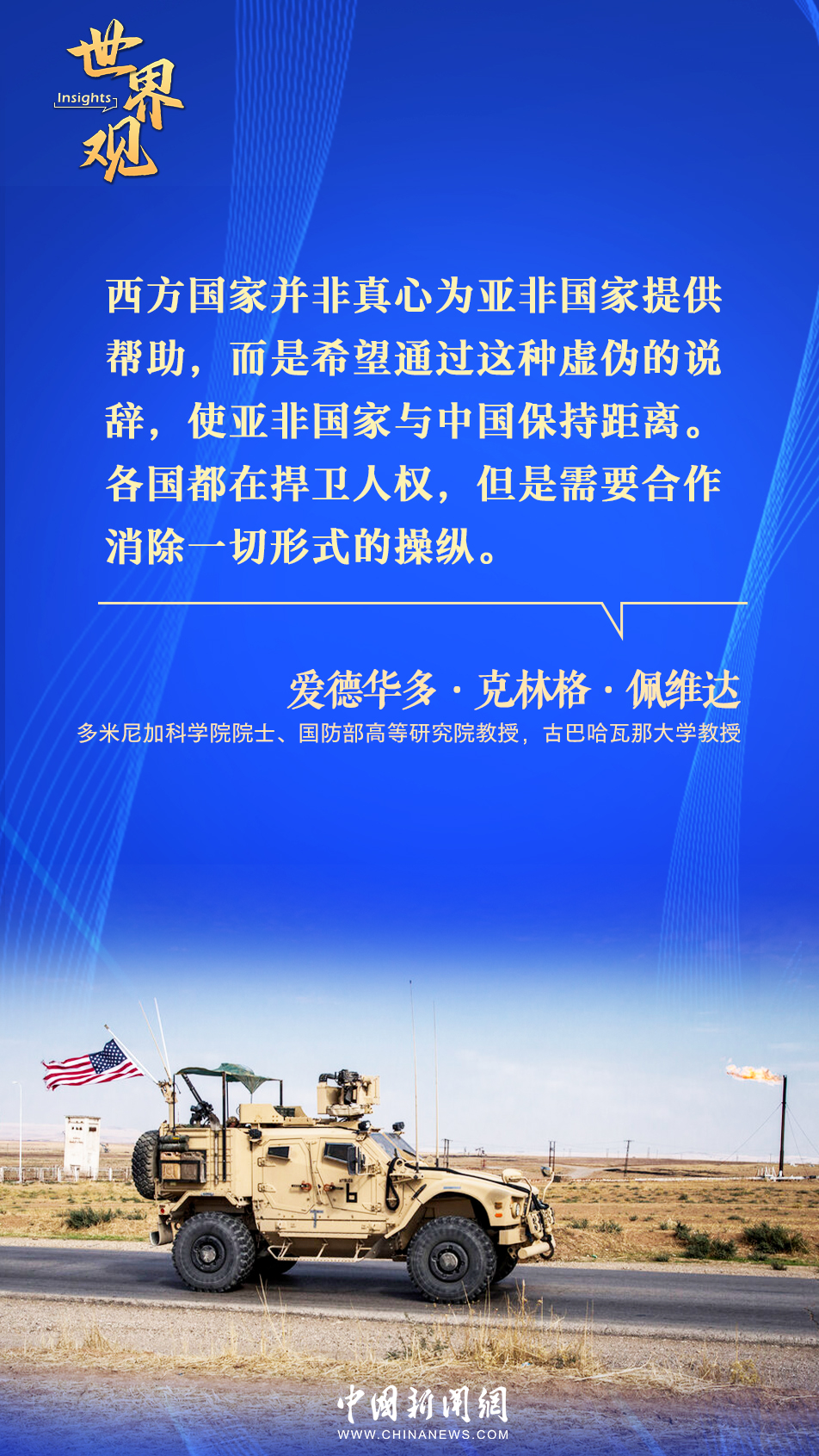 多米尼加科學(xué)院院士、國防部高等研究院教授、古巴哈瓦那大學(xué)教授愛德華多·克林格·佩維達(dá)表示,西方對亞非國家的幫助是虛偽的,其真實(shí)目的在于操縱亞非國家與中國保持距離。