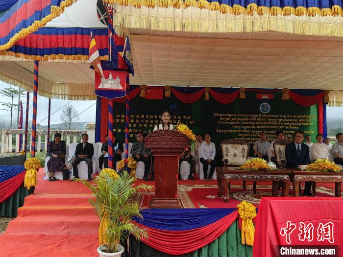 當(dāng)?shù)貢r(shí)間6月18日,“瀾湄國(guó)家典型小流域綜合治理示范(三期)”項(xiàng)目俄勒塞村成果移交儀式在柬埔寨國(guó)公省莫邦縣舉行。圖為中國(guó)駐柬埔寨大使館公使銜參贊趙海燕致辭?!≈行律缬浾?楊強(qiáng) 攝