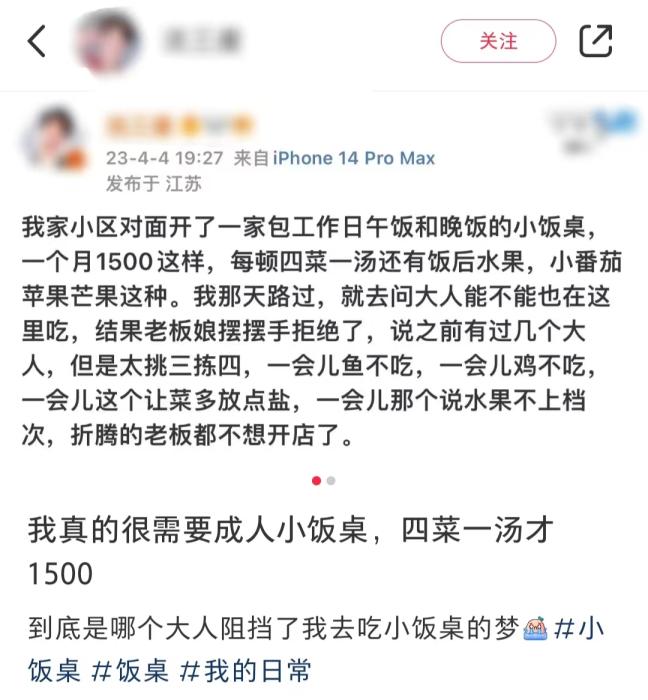 也有網(wǎng)友表示,由于自己吃太多,還被小飯桌漲了價(jià)?!耙?yàn)槌扇撕蛯W(xué)生食量和需求不同,價(jià)格都需要跟小飯桌重談。”