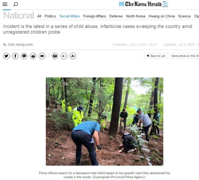 2023年7月2日,韓國慶尚南道警方稱,已向一名20多歲的男子和一名30多歲的女子發(fā)出逮捕令,原因是他們勒死了自己的孩子,并將尸體丟棄在慶尚南道巨濟(jì)附近的一條河里。