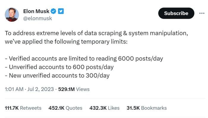 收購(gòu)近一年,馬斯克對(duì)于推特的改革仍在進(jìn)行中。他最新宣布要限制用戶(hù)每日的推文瀏覽量,以避免使用人工智能模型的公司對(duì)推特進(jìn)行“數(shù)據(jù)抓取和系統(tǒng)操縱”。