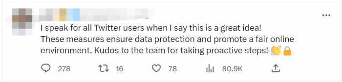 但也有網(wǎng)友對(duì)此表示歡迎,表示“我代表所有的推特用戶(hù)聲明,這是一個(gè)好主意!這些措施能確保數(shù)據(jù)得到保護(hù),同時(shí)促進(jìn)公平的網(wǎng)絡(luò)環(huán)境。感謝團(tuán)隊(duì)采取積極措施?!?/p>