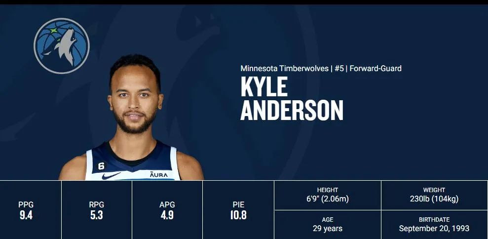 1993年9月出生的安德森將年滿30周歲,身高兩米零六的他于2014年選秀中在第1輪第30順位被馬刺隊選中,如今效力于森林狼的他已是聯(lián)盟中身手最為全面的鋒衛(wèi)搖擺人之一。