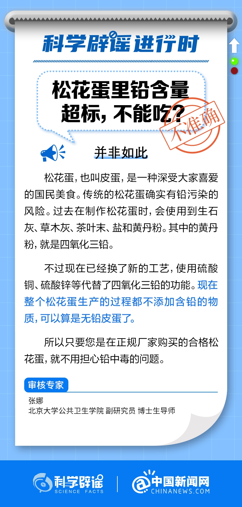 過去在制作松花蛋時(shí),會(huì)使用到生石灰、草木灰、茶葉末、鹽和黃丹粉。其中的黃丹粉,就是四氧化三鉛。不過現(xiàn)在已經(jīng)換了新的工藝,使用硫酸銅、硫酸鋅等代替了四氧化三鉛的功能?,F(xiàn)在整個(gè)松花蛋生產(chǎn)的過程都不添加含鉛的物質(zhì),可以算是無鉛皮蛋了。(來源:科學(xué)辟謠、中國(guó)新聞網(wǎng)微博)