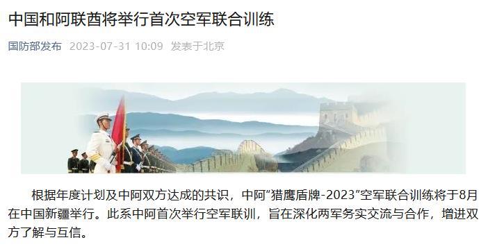 中新網(wǎng)7月31日電 據(jù)“國防部發(fā)布”微信公眾號31日消息,根據(jù)年度計劃及中阿雙方達成的共識,中阿“獵鷹盾牌-2023”空軍聯(lián)合訓練將于8月在中國新疆舉行。此系中阿首次舉行空軍聯(lián)訓,旨在深化兩軍務實交流與合作,增進雙方了解與互信。