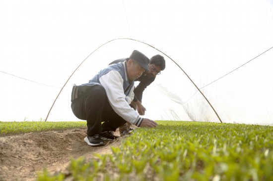 巴基斯坦旁遮普省木爾坦的中巴辣椒訂單種植項目辣椒育苗大棚內,中國農業(yè)專家?guī)ьI巴基斯坦技術員查看辣椒秧苗生長情況。