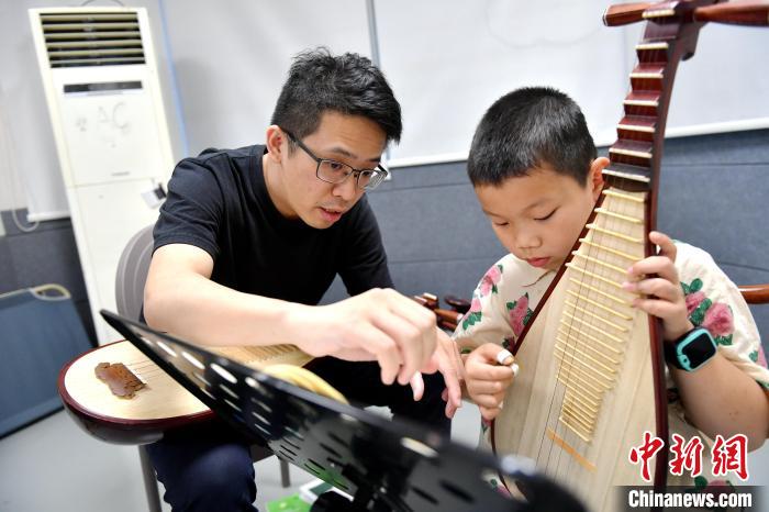 中新網(wǎng)福州8月2日電 (葉秋云)“左手大拇指不要太靠后”“手移動的時(shí)候,手臂要跟著移動,彈的時(shí)候才不會怪怪的”……從演奏姿勢、轉(zhuǎn)腕到手指的彈挑,魏辰運(yùn)手把手指導(dǎo)著一位8歲小男孩彈琵琶。