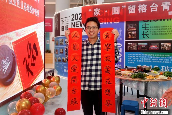 圖為魏辰運(yùn)參加留榕臺青圍爐守歲話新年活動并展示自己寫的春聯(lián)。呂明 攝