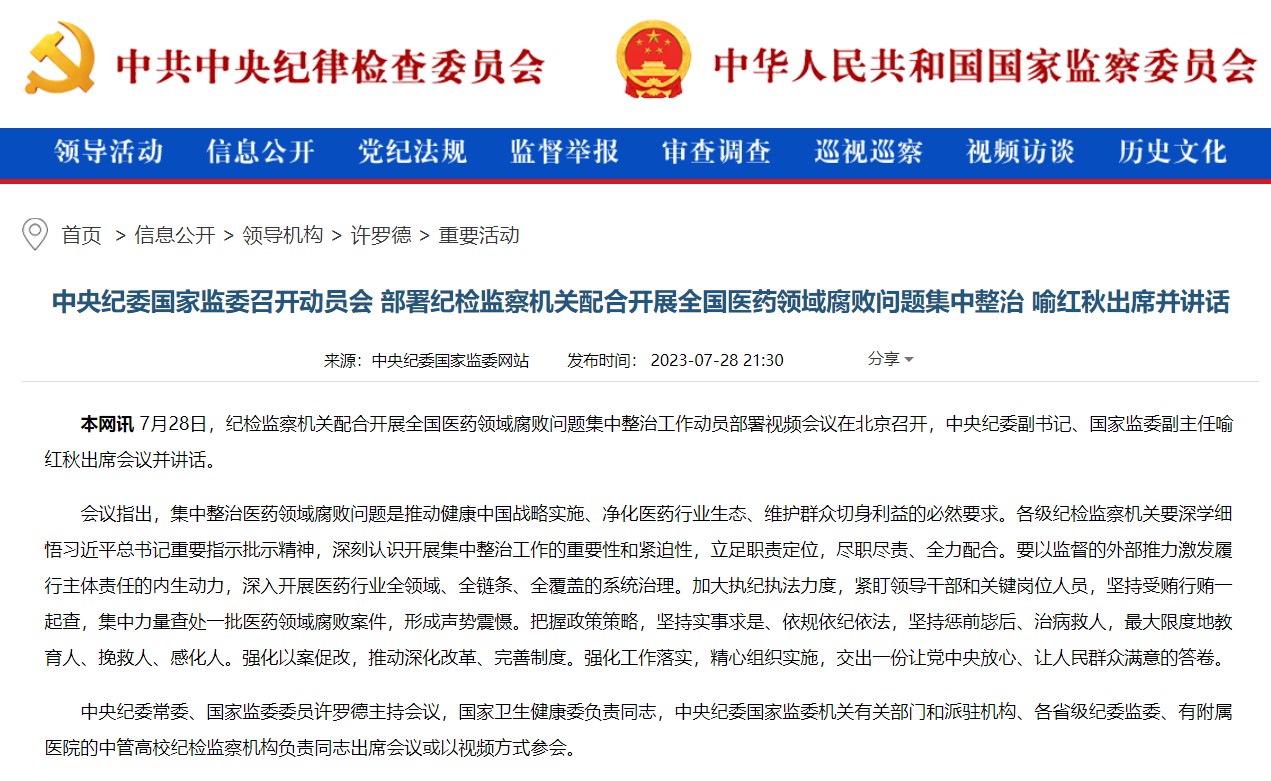 7月21日,國家衛(wèi)生健康委會同教育部、公安部、審計署、國務(wù)院國資委、市場監(jiān)管總局、國家醫(yī)保局、國家中醫(yī)藥局、國家疾控局、國家藥監(jiān)局,十個部門聯(lián)合召開視頻會議,部署開展為期1年的全國醫(yī)藥領(lǐng)域腐敗問題集中整治工作。