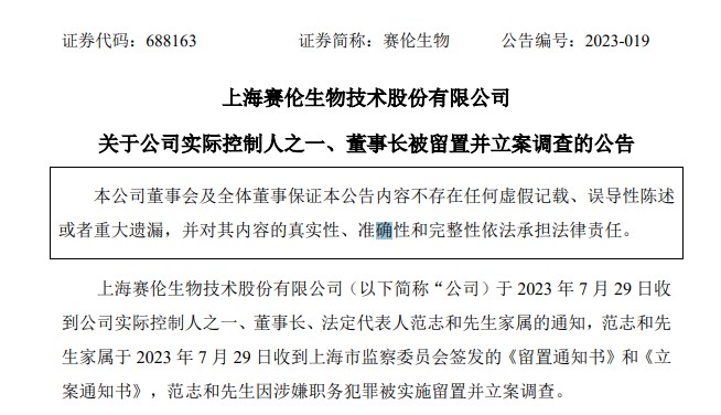 公告稱,賽倫生物實際控制人之一、董事長、法定代表人范志和于2023年7月29日收到上海市監(jiān)察委員會簽發(fā)的《留置通知書》和《立案通知書》,范志和因涉嫌職務(wù)犯罪被實施留置并立案調(diào)查。