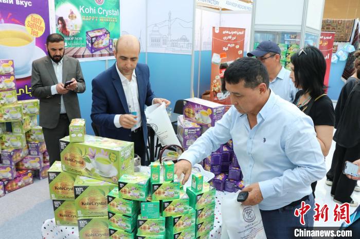 當?shù)貢r間8月3日,哈薩克斯坦阿斯塔納,阿富汗商品展當日啟幕。圖為阿富汗茶葉展位吸引當?shù)仡櫩婉v足?! ≈行戮W(wǎng)記者 張碩 攝