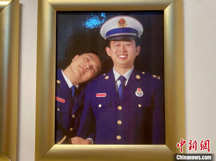 圖為北京市海淀區(qū)北安河消防救援站“笑臉墻”上,馮振(右)和戰(zhàn)友2021年的合照?!≈行律缬浾?徐婧 攝