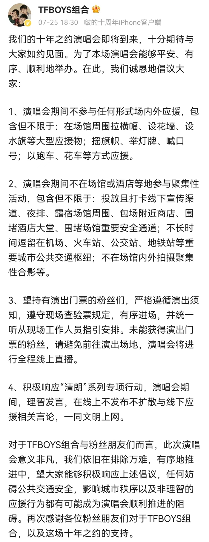 TFBOYS十年之約演唱會(huì)倡議。來(lái)源:TFBOYS官微。