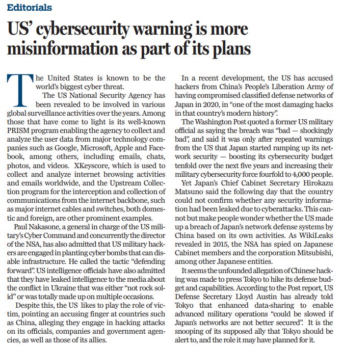原標(biāo)題:US' cybersecurity warning is more misinformation as part of its plans