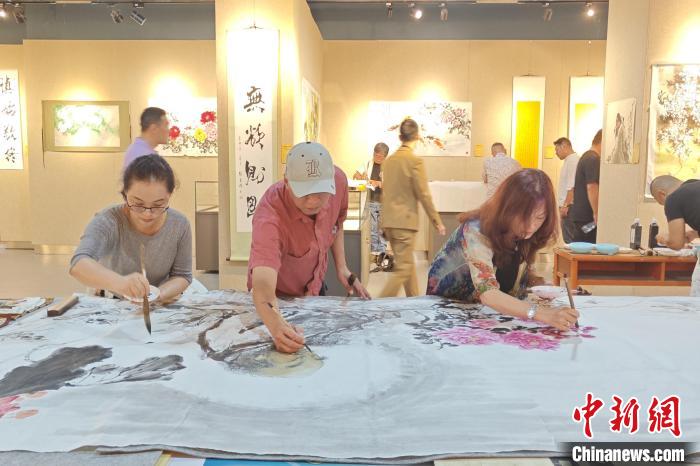 8月9日,張明琴(右一)在福建泉州與藝術(shù)家們共繪國畫作品。 吳冠標(biāo) 攝