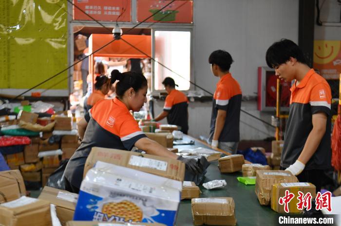 8月9日,在涿州市一家快遞公司,工作人員分揀來(lái)自轉(zhuǎn)運(yùn)中心的快件。 中新社記者 韓冰 攝