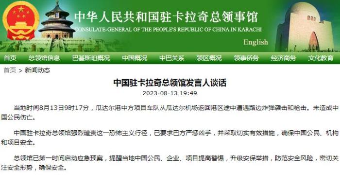中國駐卡拉奇總領(lǐng)館強(qiáng)烈譴責(zé)這一恐怖主義行徑,已要求巴方嚴(yán)懲兇手,并采取切實(shí)有效措施,確保中國公民、機(jī)構(gòu)和項目安全。
