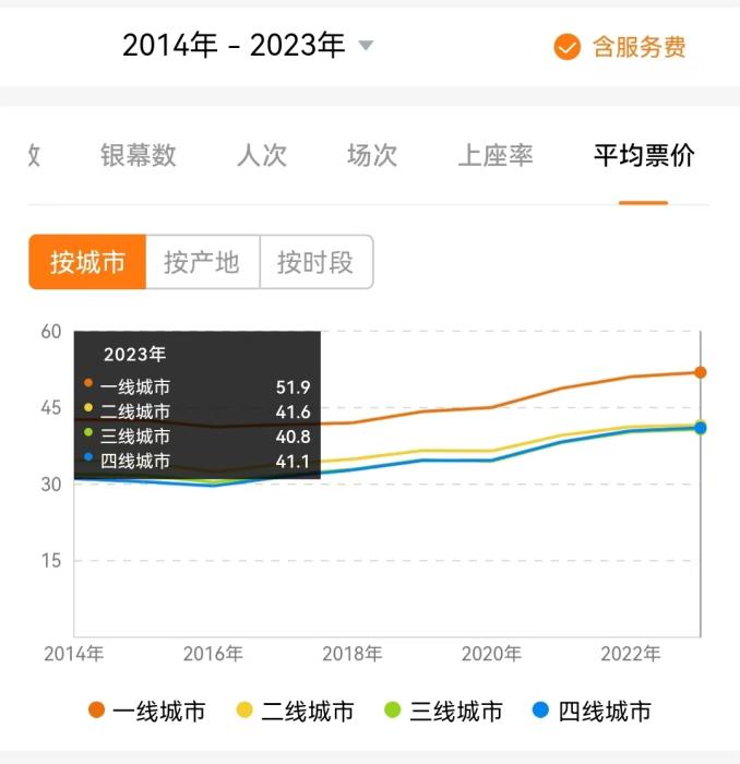 另外,相較二三四線城市,一線城市票價明顯較貴。繼2022年沖上50元大關后,2023年,一線城市平均票價達到51.9元,二三四線城市近兩年則漲至40元以上。