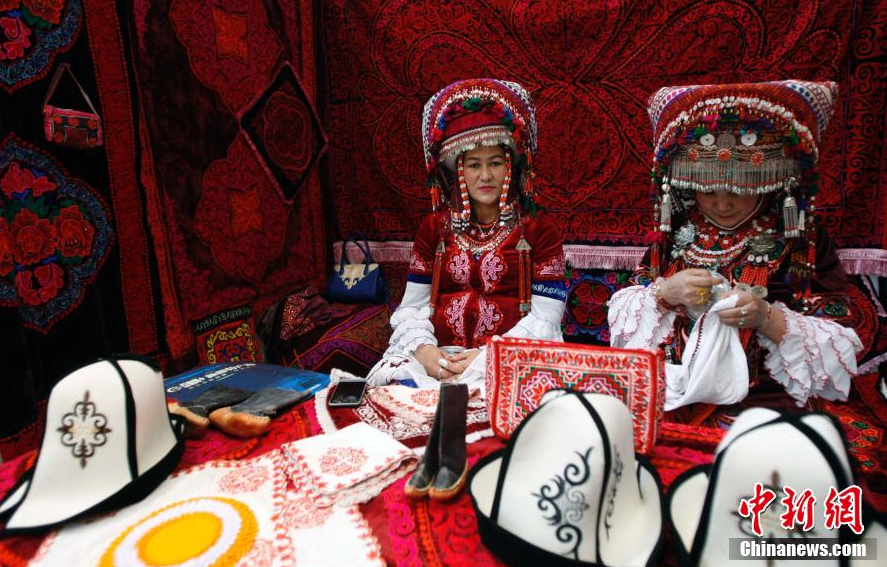 圖為新疆柯爾克孜族手工刺繡展臺(tái)。王小軍 攝