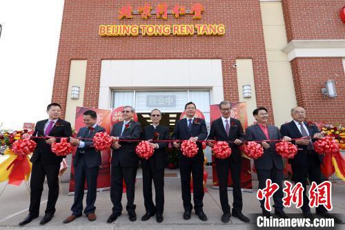 當(dāng)?shù)貢r(shí)間9月1日,加拿大多倫多,北京同仁堂位于大多倫多地區(qū)的第四家分店在安大略省列治文山(Richmond Hill)市開業(yè)。圖為北京同仁堂國藥有限公司董事曾鈺成(左四),中國貿(mào)促會(huì)駐加拿大代表處總代表徐強(qiáng)(左五),加拿大中藥商會(huì)會(huì)長張瑞端(左八),北京同仁堂(多倫多)有限公司副總經(jīng)理肖常國(左二)及當(dāng)?shù)卣绱淼燃钨e出席開業(yè)儀式并剪彩?!≈行律缬浾?余瑞冬 攝