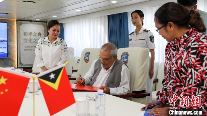 9月3日上午,正在執(zhí)行“和諧使命-2023”任務的中國海軍“和平方舟”號醫(yī)院船抵達東帝汶帝力港,開始為期7天的友好訪問和醫(yī)療服務。圖為東帝汶總統(tǒng)奧爾塔在醫(yī)院船簽名簿上留言。黎宇 攝