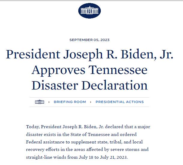 中新網(wǎng)9月6日電 據(jù)白宮官網(wǎng)消息,當?shù)貢r間9月5日,美國總統(tǒng)拜登批準田納西州重大災(zāi)難聲明,并下令為田納西州從7月18日開始至7月21日期間受風暴影響的地區(qū)提供聯(lián)邦援助。
