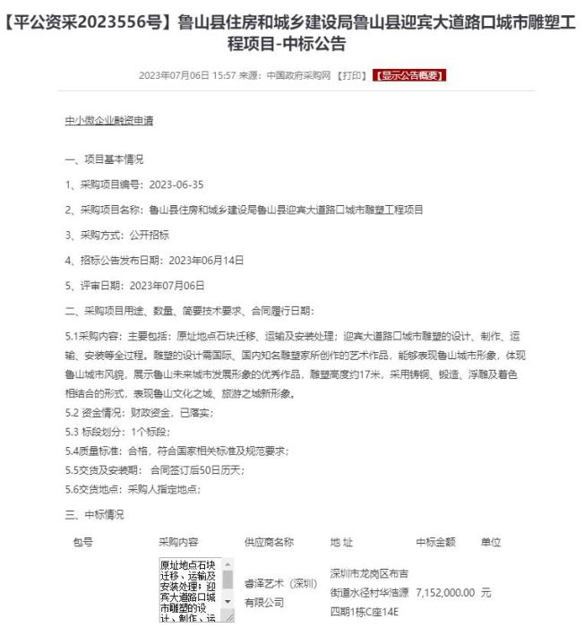 中國政府采購網(wǎng)公開的中標(biāo)公告顯示,這座位于魯山縣迎賓大道路口城市雕塑工程項目,中標(biāo)金額達(dá)到715.2萬元,資金情況為“財政資金,已落實”。