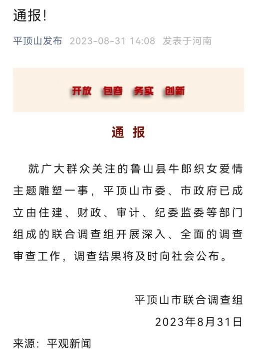 8月31日,“平頂山發(fā)布”公眾號發(fā)布通報,就廣大群眾關(guān)注的魯山縣牛郎織女愛情主題雕塑一事,平頂山市委、市政府已成立由住建、財政、審計、紀(jì)委監(jiān)委等部門組成的聯(lián)合調(diào)查組開展深入、全面的調(diào)查審查工作,調(diào)查結(jié)果將及時向社會公布。