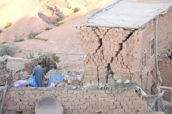 9月9日,在摩洛哥馬拉喀什附近,居民查看遭地震損毀的建筑。新華社發(fā)(艾薩攝)