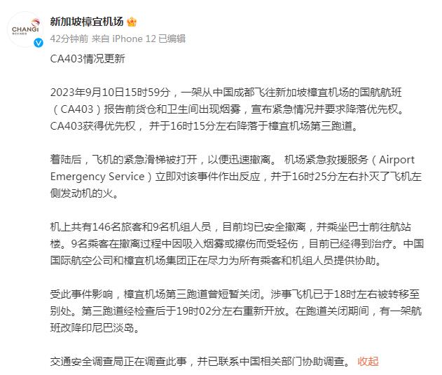 中新網(wǎng)北京9月10日電 據(jù)新加坡樟宜機(jī)場(chǎng)官方微博消息,2023年9月10日15時(shí)59分,一架從中國(guó)成都飛往新加坡樟宜機(jī)場(chǎng)的國(guó)航航班(CA403)報(bào)告前貨倉和衛(wèi)生間出現(xiàn)煙霧,宣布緊急情況并要求降落優(yōu)先權(quán)。CA403獲得優(yōu)先權(quán), 并于16時(shí)15分左右降落于樟宜機(jī)場(chǎng)第三跑道。