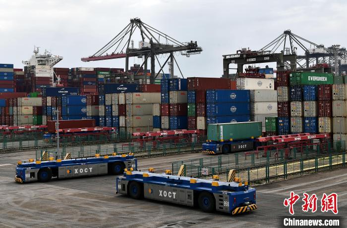 9月7日,廈門遠(yuǎn)海自動(dòng)化碼頭上,轉(zhuǎn)運(yùn)集裝箱的自動(dòng)導(dǎo)引車正在作業(yè)。這是全球首個(gè)第四代自動(dòng)化碼頭、中國(guó)首個(gè)擁有全部自主知識(shí)產(chǎn)權(quán)的自動(dòng)化碼頭,開(kāi)行了多條“絲路海運(yùn)”命名航線?!≈行律缬浾?張斌 攝