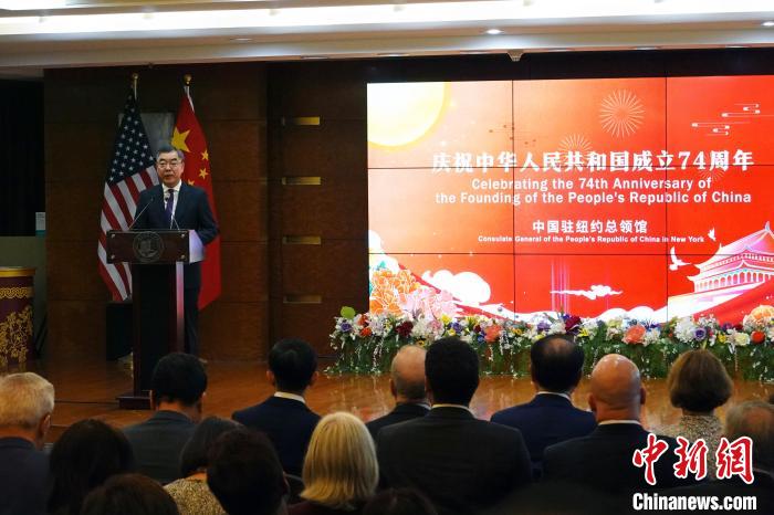 當(dāng)?shù)貢r(shí)間9月13日,中國駐紐約總領(lǐng)館在紐約舉行慶祝中華人民共和國成立74周年招待會(huì),領(lǐng)區(qū)政商學(xué)媒等各界代表近400人出席。圖為中國駐紐約總領(lǐng)事黃屏發(fā)表講話?!≈行律缬浾?王帆 攝