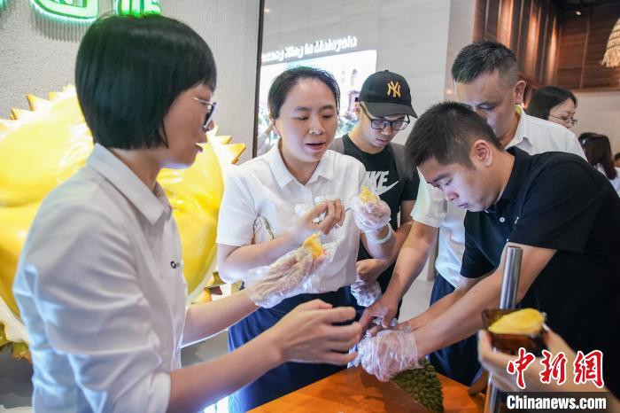 9月14日,廣西南寧消費(fèi)者搶“鮮”品嘗產(chǎn)自馬來(lái)西亞“貓山王之鄉(xiāng)”——彭亨州勞勿縣的榴蓮?!≈行律缬浾?陳冠言 攝