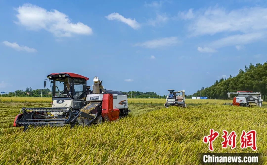安徽省合肥市廬江縣廣寒村河廣家庭農場,農機手操作農機在大田里收割早稻。左學長 攝