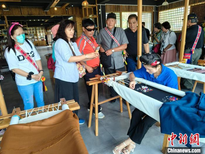 9月17日,來自臺灣花蓮縣光復(fù)鄉(xiāng)的村民在貴州西江千戶苗寨參觀苗繡制作?!∏褫W軻 攝