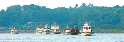 瀾滄江—湄公河從中國關累到泰國清盛一段航運最為繁忙,大量物資在中老緬泰四國間運輸往來。裝滿貨物的各國商船在水面上來回穿梭,一片繁忙;兩岸村莊升起裊裊炊煙,一片祥和。長期在湄公河上跑船的一名船長說:“有聯(lián)合巡邏執(zhí)法編隊在,我們跑船很放心。感謝四國聯(lián)合巡邏執(zhí)法為湄公河帶來了安寧!”