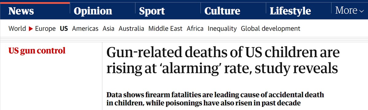 據(jù)英國《衛(wèi)報》網站5日報道,美國波士頓兒童醫(yī)院(Boston Children's Hospital)研究人員進行的一項新的研究發(fā)現(xiàn),在過去十年中,美國與槍支有關的兒童死亡人數(shù)激增,漲幅高達87%。