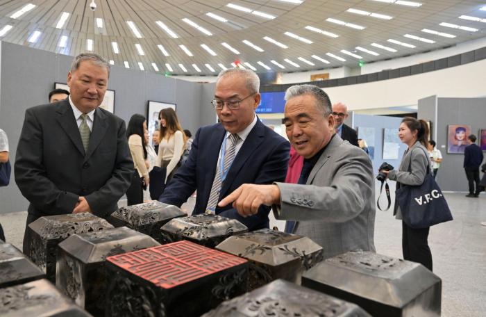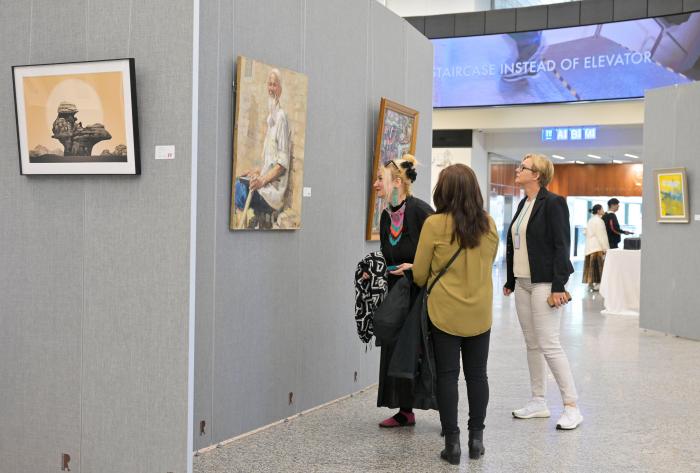 開幕式現(xiàn)場氣氛熱烈,各國外交官及國際職員們被參展藝術(shù)家的作品深深吸引,對中外藝術(shù)家通過當代藝術(shù)角度,表達對中國式現(xiàn)代化應(yīng)對全球性挑戰(zhàn)的思考、傳播推進全球發(fā)展事業(yè)和世界發(fā)展合作的意識予以高度評價,對藝術(shù)家的精彩呈現(xiàn)表達贊嘆。