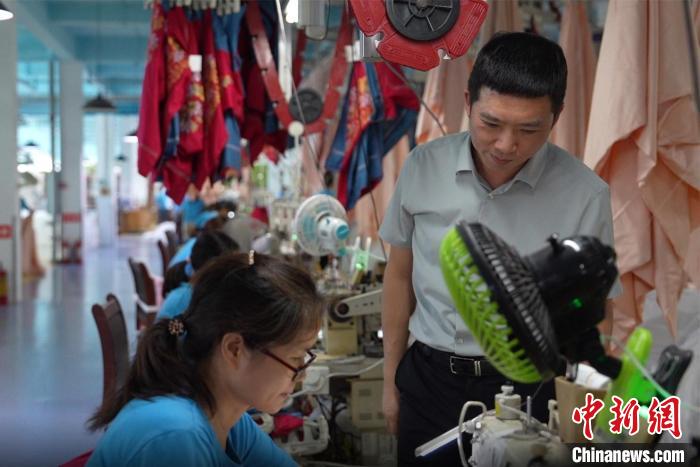 8月28日,“臺(tái)二代”、湖南富麗真金家紡有限公司總經(jīng)理杜俊毅(右)在車間與員工交流。 楊世豪 攝