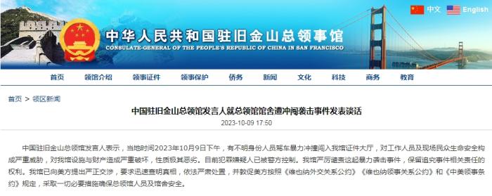 中國(guó)駐舊金山總領(lǐng)館回應(yīng)遭沖闖襲擊:已向美方提出嚴(yán)正交涉!