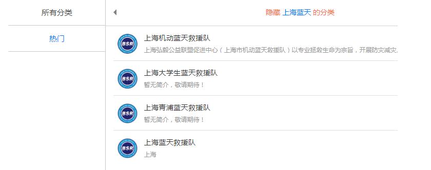 “藍天救援·中國”官網(wǎng)品牌授權(quán)隊伍查詢中,上海藍天旗下分類有4支隊伍