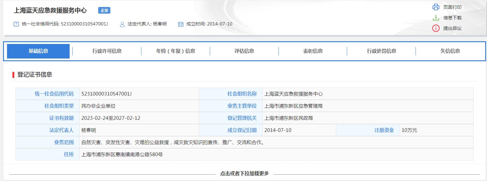 企查查信息顯示,上海藍天應(yīng)急救援服務(wù)中心成立于2014年,法人為楊春明。全國社會組織信用信息公示平臺顯示,其成立登記日期為2014年7月10日,系民辦非企業(yè)單位,登記管理機關(guān)為上海市浦東新區(qū)民政局。