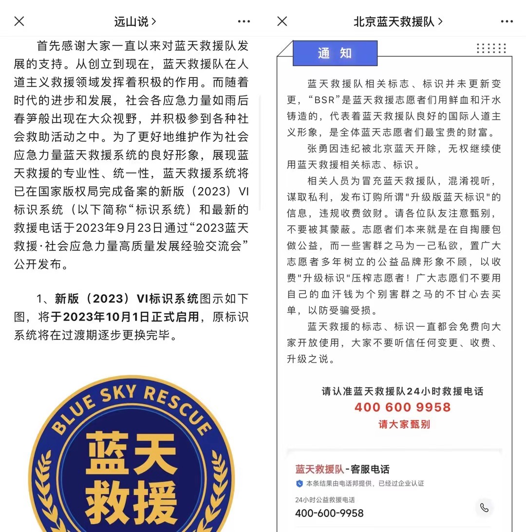 中新網(wǎng)注意到,今年9月30日,張勇在“遠山說”公眾號上發(fā)布了《藍天救援關(guān)于更換VI標識系統(tǒng)、救援電話的公告》,稱將于2023年10月1日正式啟用。就在啟用當天,北京藍天救援隊公眾號發(fā)布信息稱“藍天救援隊相關(guān)標志、標識并未更新變更。不要聽信任何變更、收費、升級之說。”